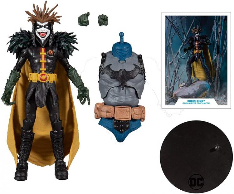 Dall'angolo più sinistro del Multiverso Oscuro arriva Robin King, una giovane versione di Bruce Wayne che ha scelto un percorso inaspettato e orribile da seguire. Piuttosto che diventare Batman, questo tormentato Bruce ha abbracciato la sua oscurità interiore in tenera età, indossando il suo costume da Robin e dedicando la sua vita al male. La sua cintura di utilità è piena fino all'orlo di armi progettate per sconfiggere ogni eroe nel multiverso DC, rendendo Robin King il soldato più sadico dell'esercito malvagio di Batman Who Laughs!