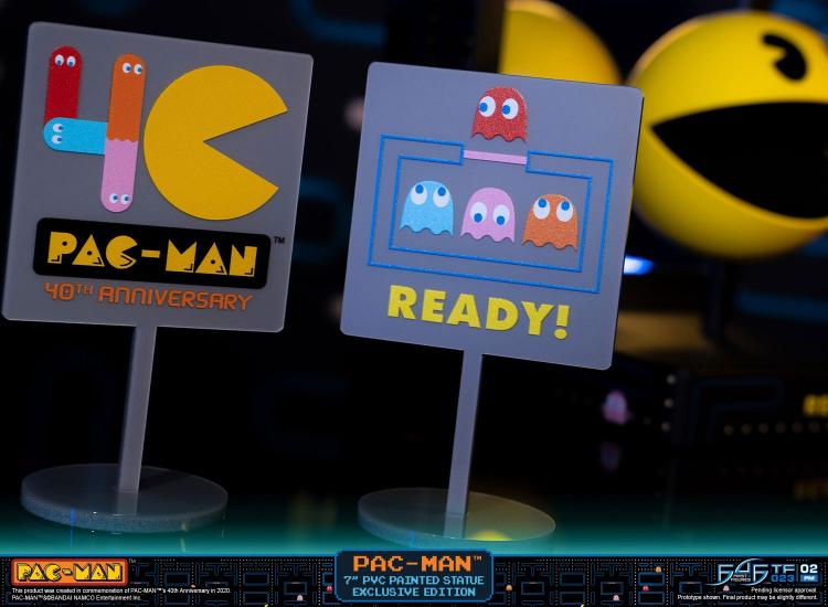 L'edizione esclusiva di questa statua viene fornita con due supporti in acrilico, uno dei quali ha il logo PAC-Man 40th Anniversary e l'altro presenta tutti e quattro i fantasmi, ovvero BLINKY, INKY, CLYDE e PINKY con il "READY!" segnale che vedi all'inizio di ogni round prima che i fantasmi vengano liberati.