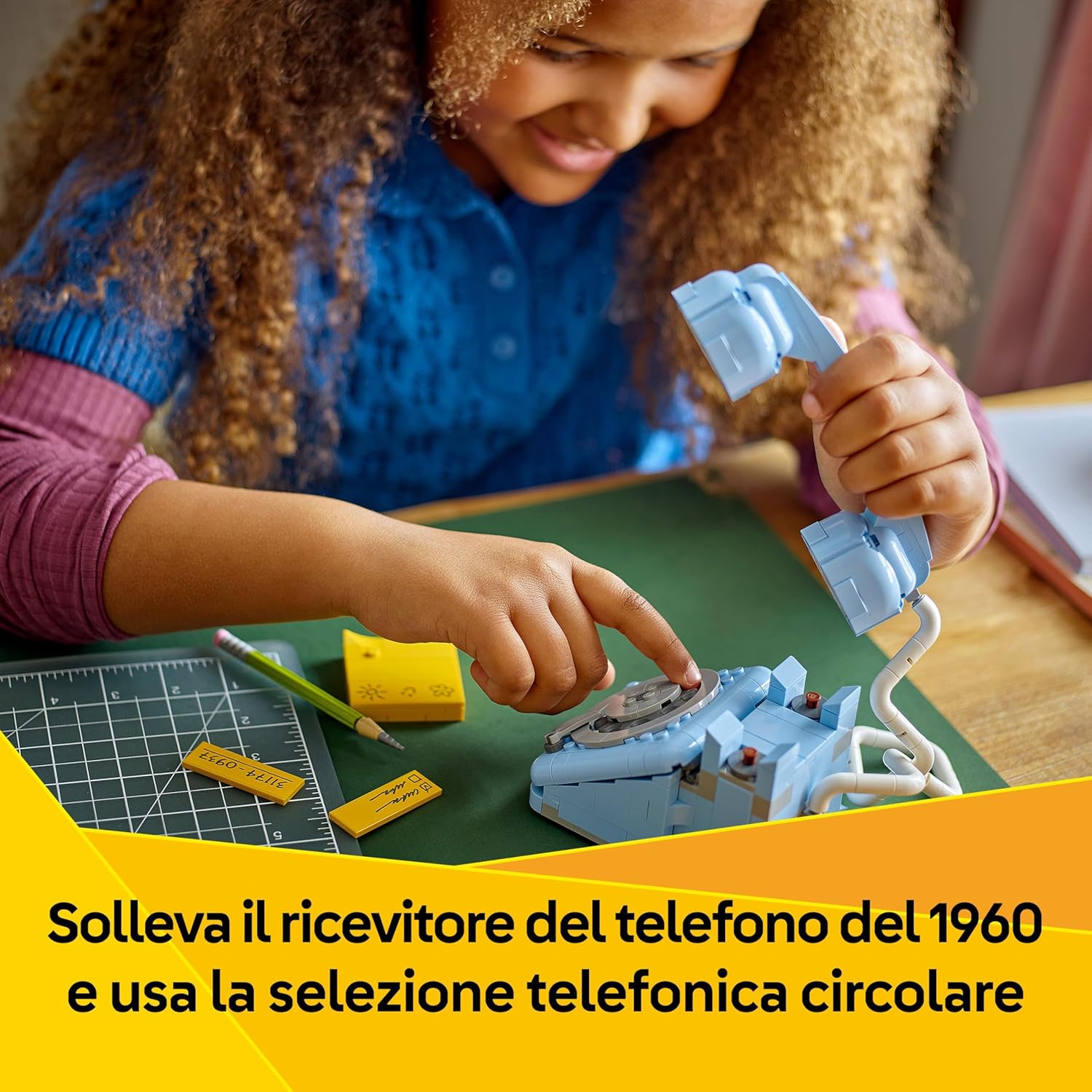 3 opzioni di costruzione di telefoni retrò in 1 scatola: il Telefono retrò LEGO Creator 3 in 1 permette ai bambini dagli 8 anni in su di costruire e ricostruire 3 diversi modelli in stile retrò con gli stessi mattoncini. Dimensioni: un set giocattolo nostalgico ricostruibile di 383 pezzi contenente un telefono a disco giocatt olo degli anni ’60 che misura 7 cm di altezza, 15 cm di larghezza e 11 cm di profondità.