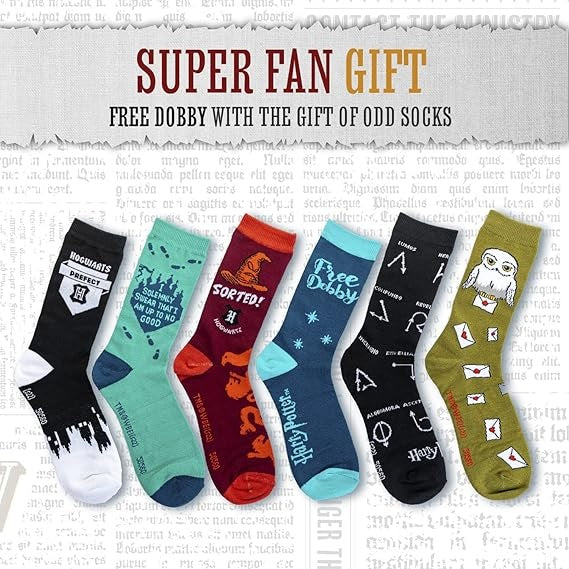 - Trio di calzini: libera un elfo domestico o mostra con orgoglio il tuo attaccamento alla serie Harry Potter con questo pacchetto di calzini di Harry Potter che include 3 paia di 6 calzini non corrispondenti confezionati in un baule studentesco di Hogwarts.