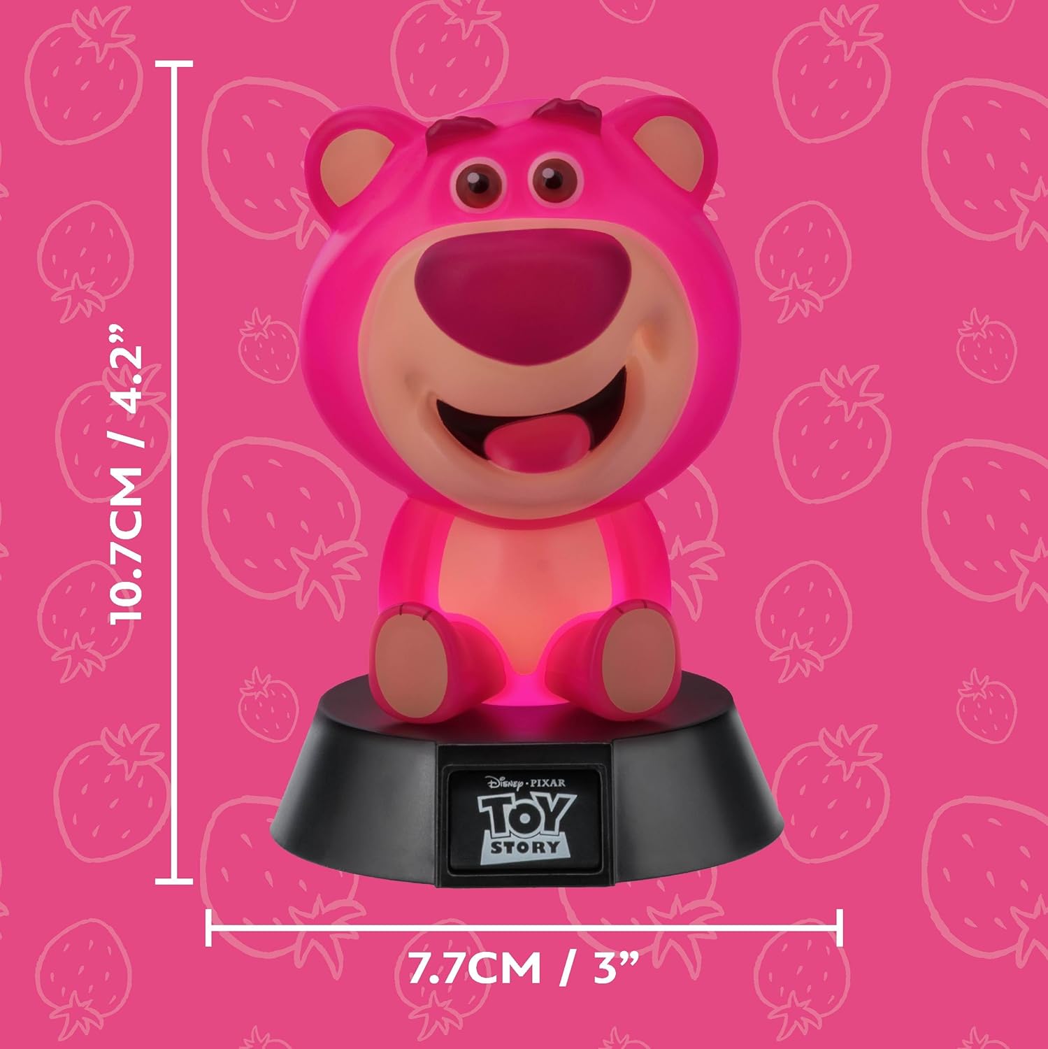 - Luce notturna: un'aggiunta perfetta a qualsiasi comodino, questa lampada Lotso di Toy Story emette una luce calda e soffusa che crea un'atmosfera accogliente all'ora di andare a letto