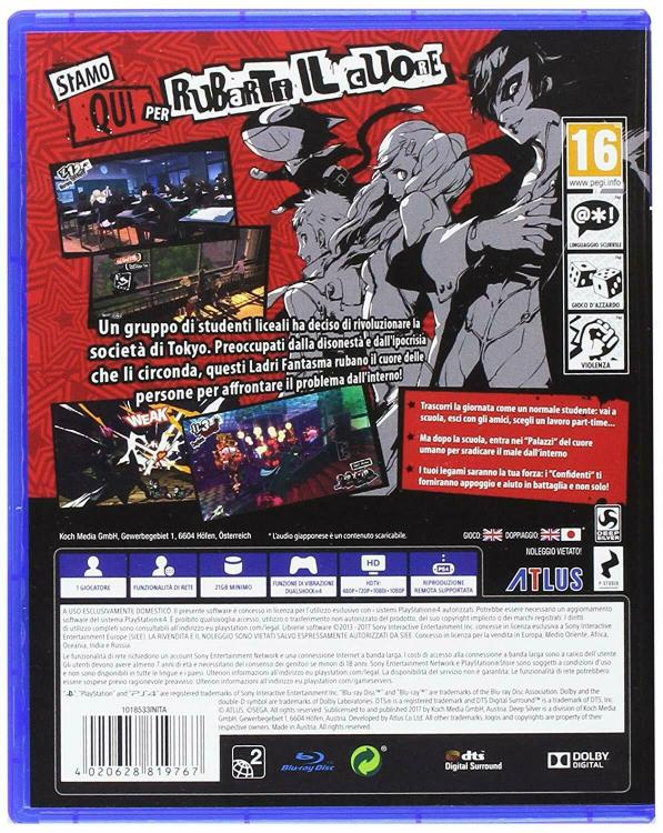 L'obiettivo dei Ladri Fantasma è quello di cercare di cambiare il mondo quotidiano in modo che si adatti alla loro percezione, strappando le maschere che la società moderna ci costringe a indossare. Per la prima volta dai tempi del sistema PS2™, torna su console la pluripremiata saga Persona 5 Emozionanti sequenze d'azione e dinamiche da gioco di ruolo giapponese a ritmo forsennato Personaggi, nemici e ambienti fantasticamente personalizzati, eleganti cut-scene in stile anime Innovativa colonna sonora acid jazz composta dal talentoso Shoji Meguro Supera vari ostacoli con le eleganti azioni dei Ladri Fantasma.