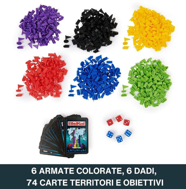 - Contenuto del gioco in scatola: Il Gioco di società Risiko contiene 1 Tabellone, 6 eserciti di colori diversi, un set da 74 carte, 6 dadi e 1 libro per le istruzioni del gioco.