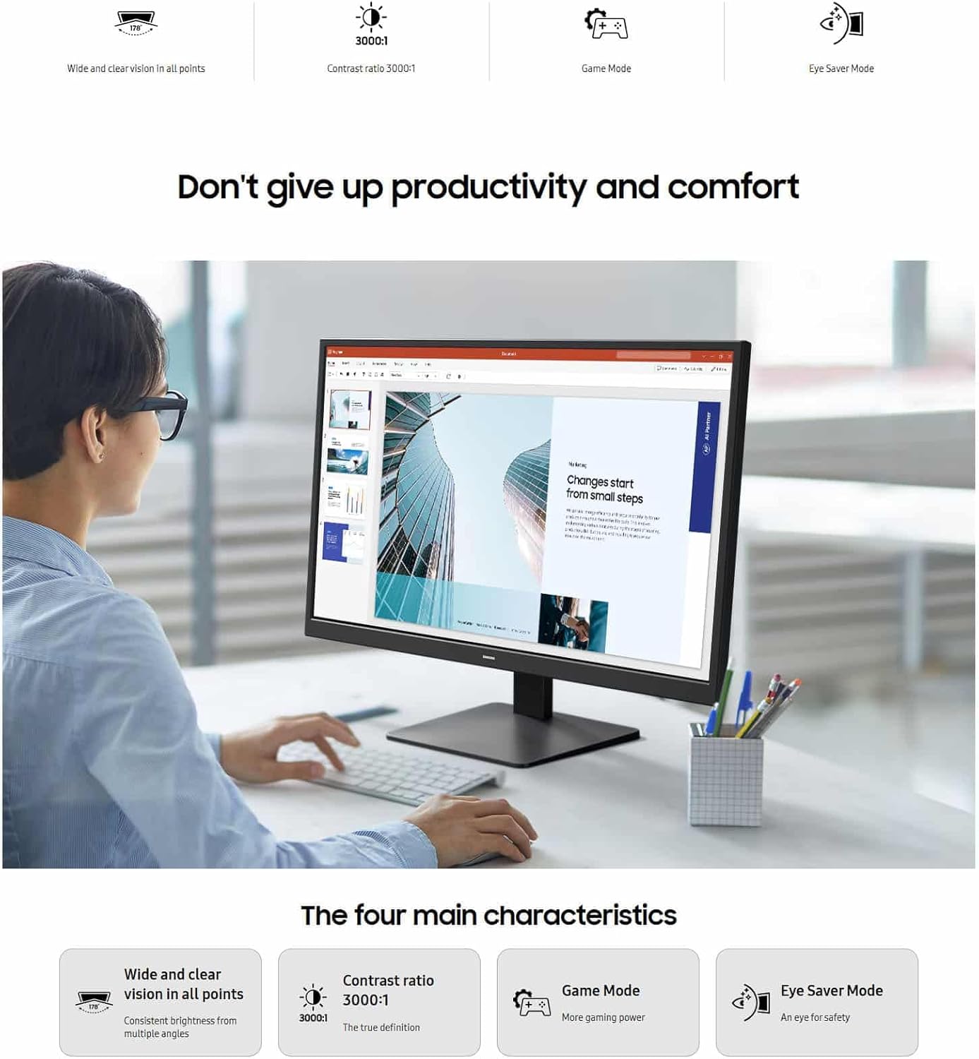 Il Monitor S31D è quindi l`ideale per chi cerca un dispositivo di alta qualità per il lavoro, il gioco o l`intrattenimento, con una visione ampia e chiara in tutti i punti e una tecnologia all`avanguardia per ridurre l`affaticamento oculare.