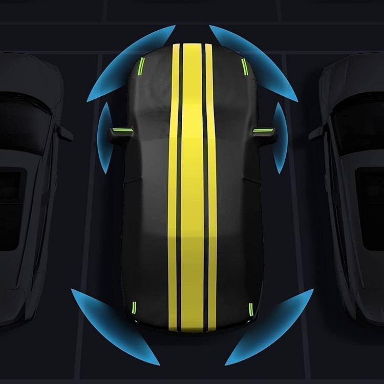 La nostra copertura per auto ha 6 strisce di avvertimento fluorescenti riflettenti per prevenire incidenti di collisione al buio, migliorando notevolmente la sicurezza per il parcheggio in strada di notte.